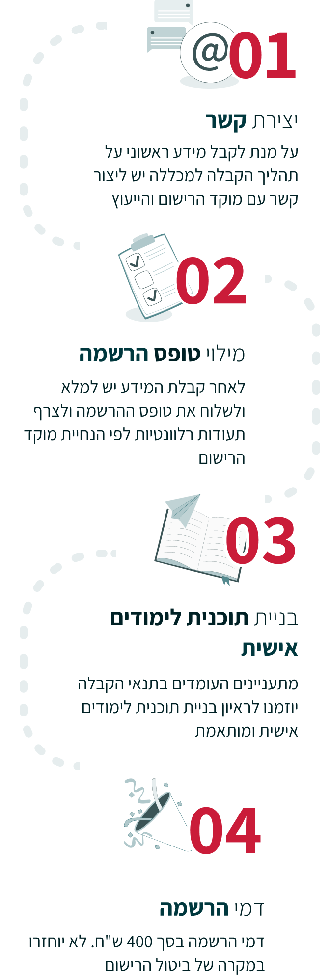 על מנת לקבל מידע ראשוני על תהליך הקבלה למכללה יש ליצור קשר עם מוקד הרישום והייעוץ